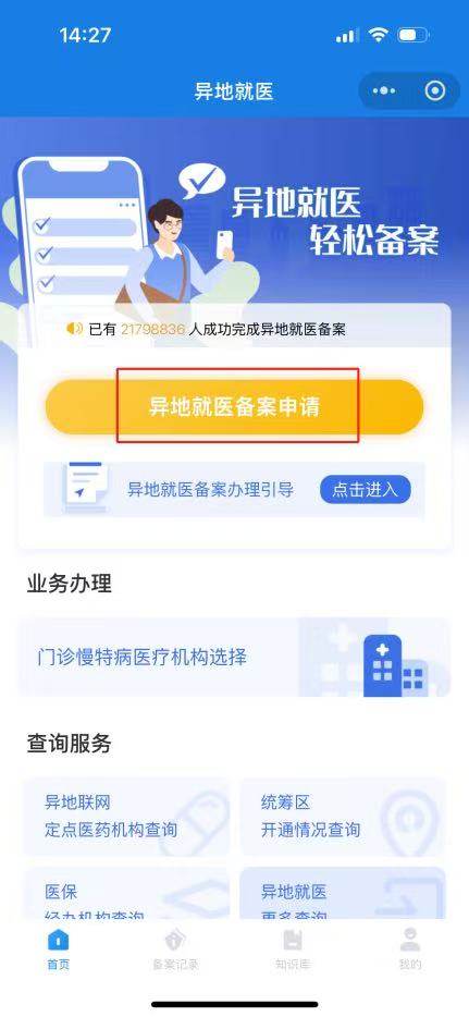 第二步:在“国家异地就医备案”小程序首页,点击“异地就医备案申请”按钮