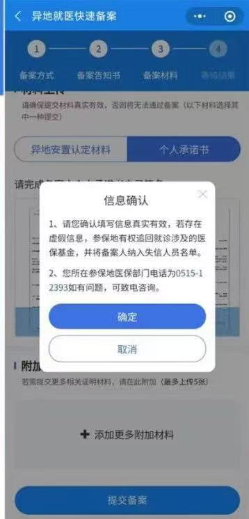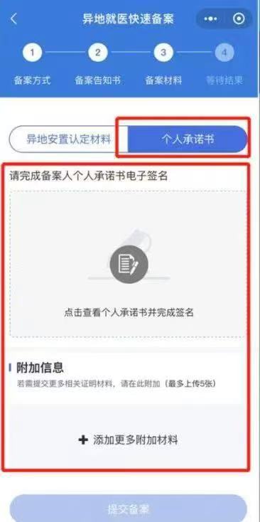 第八步:填选材料上传(选异地安置认定材料或个人承诺书其中一种即可)以下以选个人承诺书为例