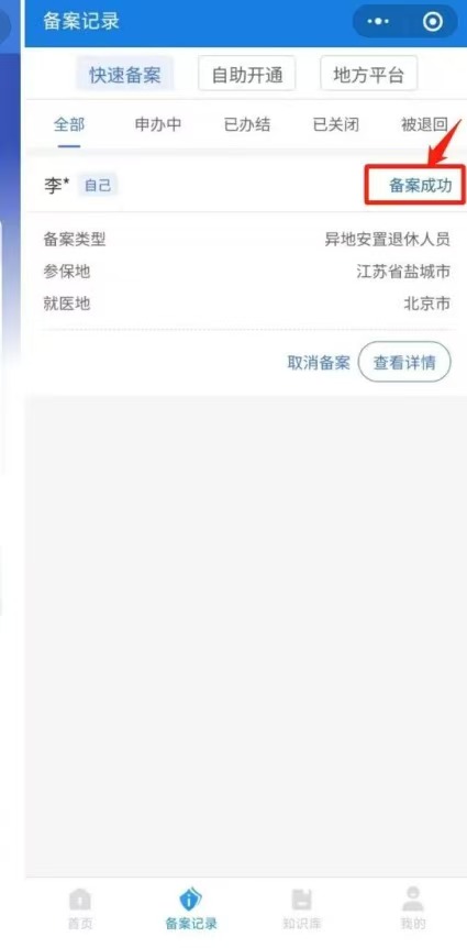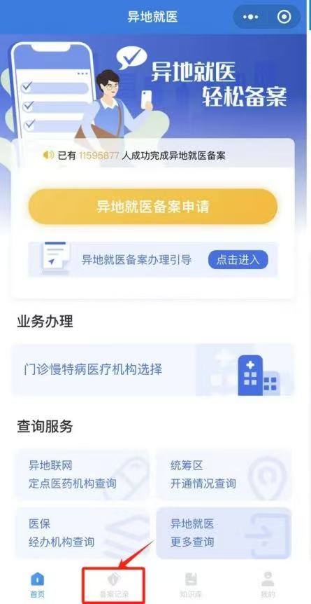 第十一步:备案信息提交后,点击首页下方菜单栏的“备案记录”按钮可查询异地就医备案进度。