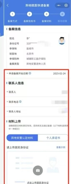第七步:填写备案开始日期(备案开始日期选住院当天或住院前一天)及联系人信息