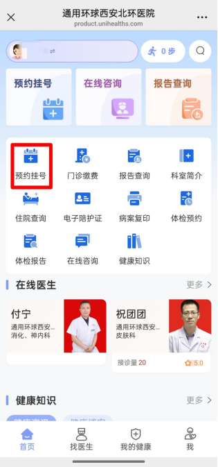 预约流程:关注“通用环球西安北环医院”微信公众号→点就诊服务→点预约挂号→点需要挂号的科室、日期及医师→点需要预约挂号的时间段→添加就诊人的信息→点支付,完成预约信息挂号。