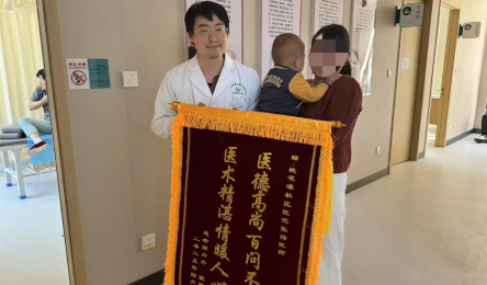 在桃花潭社区中心的走廊间,洋溢着一股暖人的氛围。身着白大褂的张扬医生,身旁站着面带笑容的周丹丹女士,她怀中抱着可爱的宝宝 ,三人共同举着一面鲜艳的锦旗,画面温馨而动人。